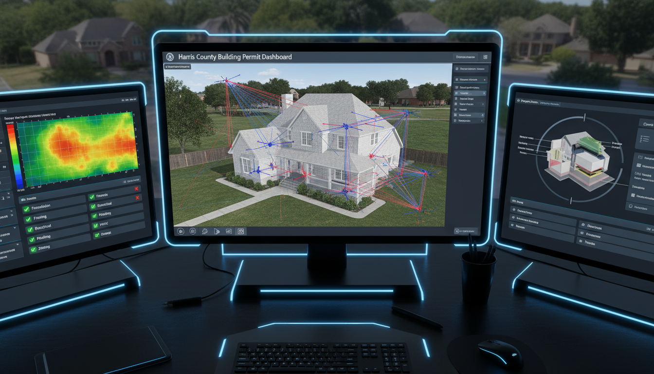 A technical, top-down view of a digital building permit dashboard showing a complex 3D BIM model of a suburban residence in Harris County with various structural analysis overlays, energy efficiency heat maps, and code compliance indicators.