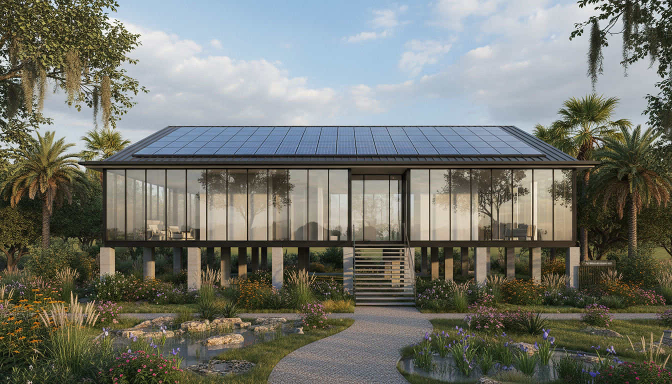 A hyper-realistic architectural rendering of a modern resilient home in Houston featuring an elevated pier-and-beam foundation, sleek impact-resistant glass facades, and integrated solar roofing, surrounded by native Texas landscaping and rain gardens.