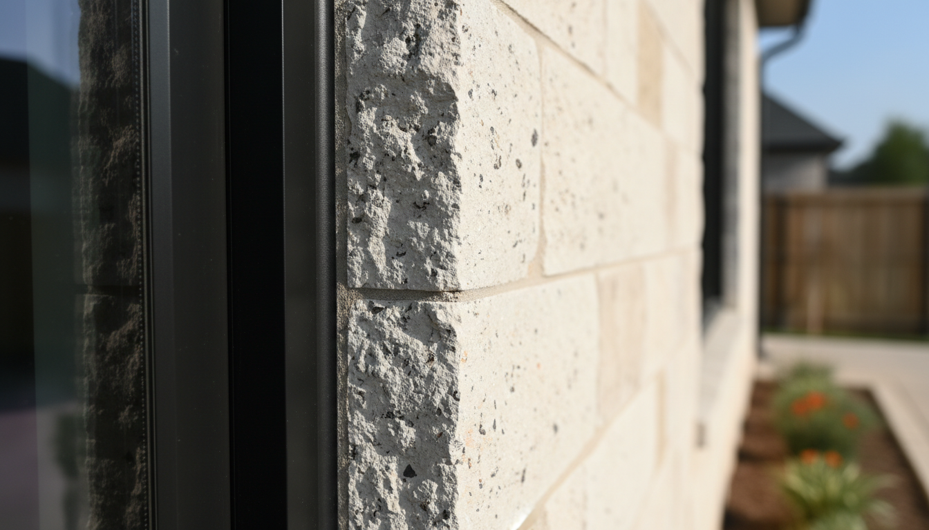 A section of light-grey Texas limestone meeting a sharp, black powder-coated steel window frame. The textures are crisp and photorealistic, showing the contrast between organic stone and man-made metal.