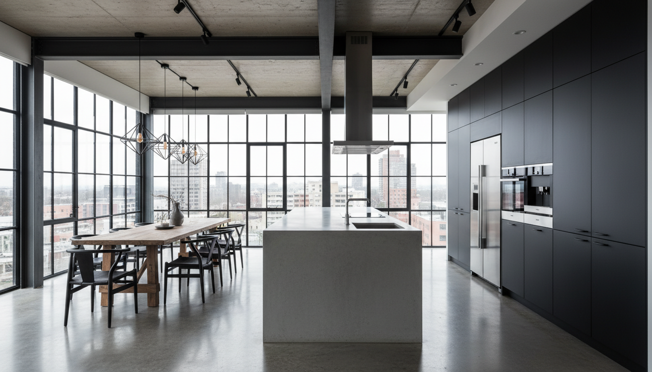 A modern kitchen and dining area. Polished concrete floors reflect the light from black-framed floor-to-ceiling windows. Exposed steel beams on the ceiling. A large island with a waterfall concrete countertop. Minimalist matte black cabinetry and high-end stainless steel appliances.