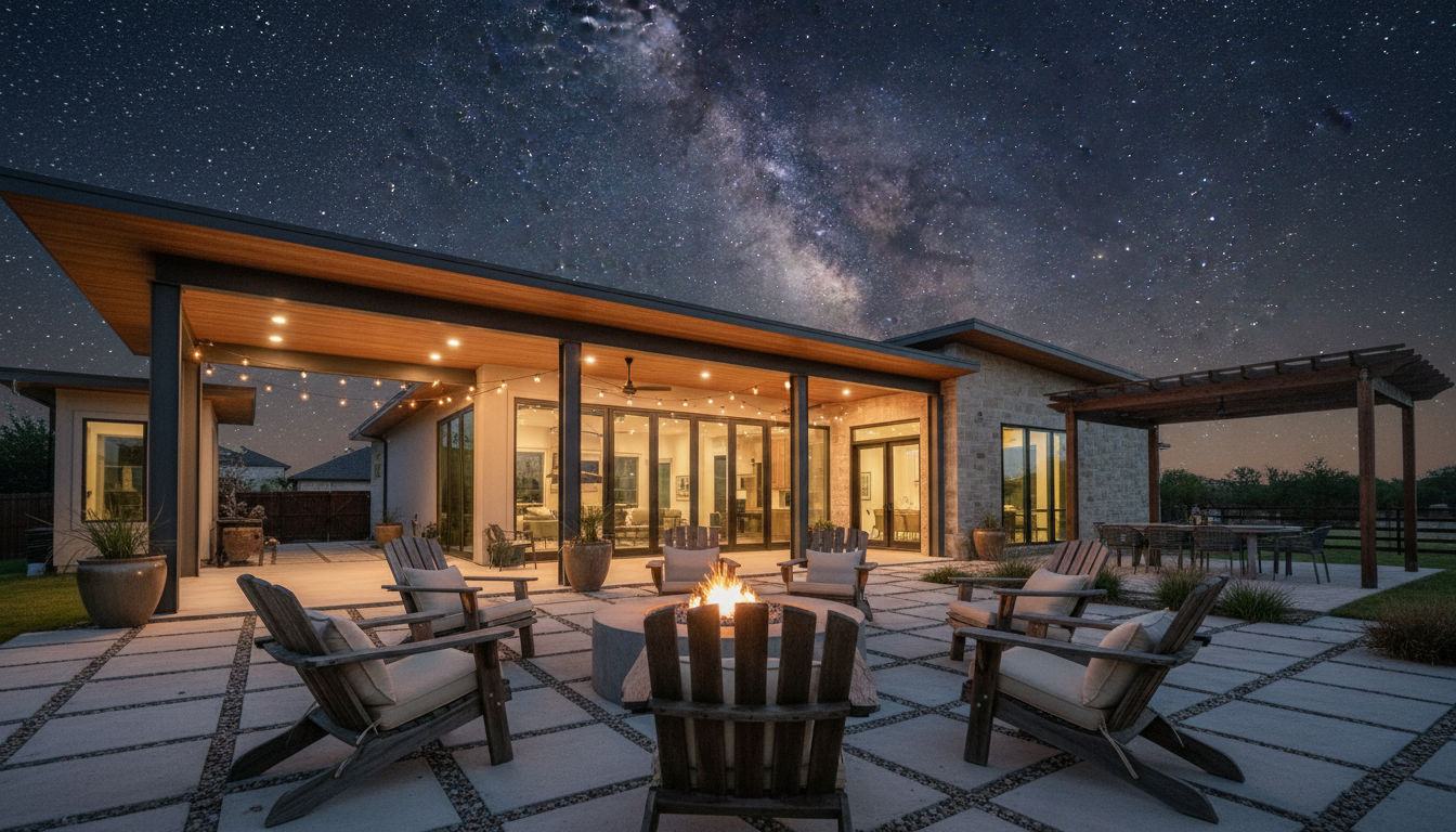 A modern home's backyard patio in Fulshear. A custom fire pit is surrounded by modern Adirondack chairs. The home's architecture is visible in the background, showing a blend of warm wood soffits and industrial steel columns under a starry Texas sky.