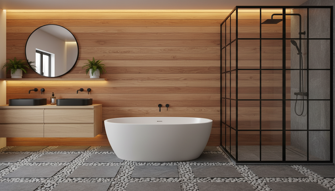 A transitional modern bathroom design. A freestanding matte white tub sits on a floor of river rocks and slate. A wall of warm cedar planks provides a backdrop, while the shower enclosure features black steel industrial-style grid glass.