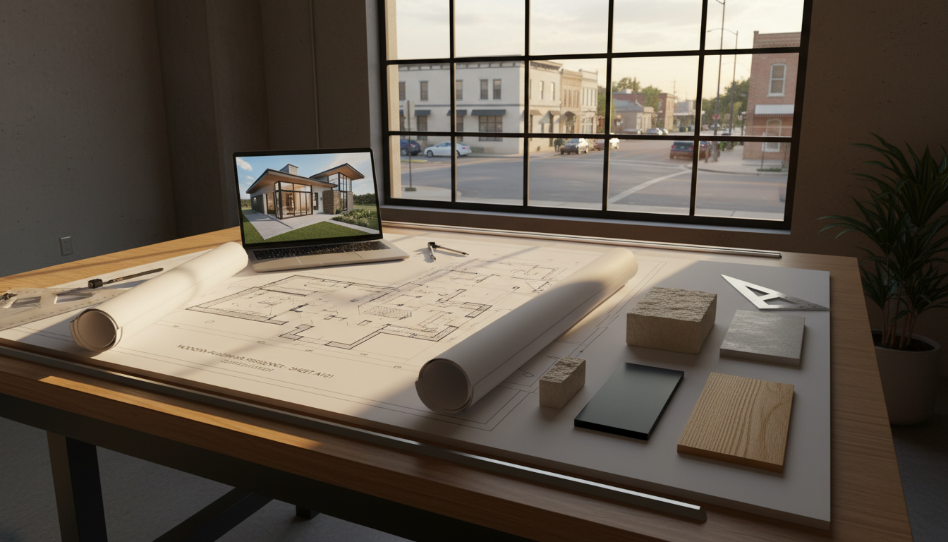 A professional architect's drafting table . On the table are blueprints for a modern Fulshear home, a set of material samples (limestone, black steel, and white oak), and a laptop showing a 3D architectural model. A window in the background shows a streetscape.